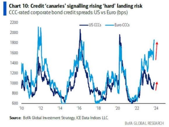 Primo, al netto del pensionamento anticipato della narrazione sul soft landing, ecco che gli spread di credito delle aziende sull’orlo del precipizio da zombie firms cominciano a segnalare il rischio opposto. Un hard landing. Di quelli da schianto contro il muro.