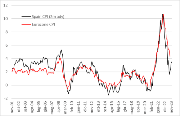 Secondo, come mostra quest’altro grafico, il trend inflazionistico in Spagna – primo Paese che nei trimestri precedenti aveva visto il CPI tornare sotto il target Bce del 2% – è tornato a crescere per il quarto mese di fila. E cosa più preoccupante, il +3,5% registrato a ottobre rispetto al +3,3% di settembre è quasi interamente ascrivibile ai costi energetici. Tanto che Pedro Sanchez si trova già a dover decidere se e come prolungare gli aiuti a famiglie e imprese.