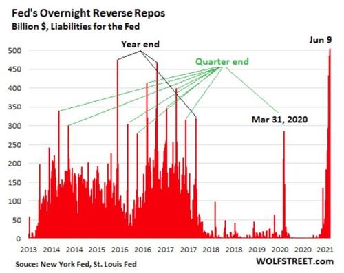 Guardate questa immagine, la quale mette in prospettiva il livello folle di utilizzo della facility di reverse repo della Federal Reserve la sera del 10 giugno: 534,34 miliardi, primato assoluto. E attenzione, perché il grafico mostra qualcosa di più: tutti i precedenti picchi di utilizzo erano coincisi con scadenze di fine anno o trimestre, legate quindi a necessità reali e tecniche di accantonamenti da parte delle banche per oneri fiscali o di altra natura. Oggi siamo nel pieno di un trend che dura da 10 giorni e la fine del trimestre dista ancora venti giorni: capite da soli, intuitivamente, che qualcosa di serio non va.