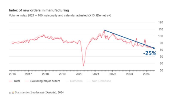 Dopo un primo, timido segnale di ripresa, a maggio il dato è tornato a calare. Si parla di -2,5% su base mensile a fronte di un +0,1% del mese precedente e attese per un +0,2%. Su base annua, addirittura -6,7% contro il precedente -3,66%. E attese per un -4,3%. E il secondo grafico ci mostra come, dal picco pre-crisi ucraina (2021), la produzione tedesca misurata attraverso l’indice di nuovi ordinativi segni -25%. Di fatto, l’Ue è solo il danno collaterale e sacrificabile della guerra Usa contro la Russia. E la Cina. E quando operi in certi modi, devi fare delle scelte. Nel 2011, la situazione era ancora calda dal fallimento Lehman e la Fed era agli inizi della grande manipolazione delle Banche centrali, quindi era sufficiente la piccola e gestibile Grecia per incorniciare l’intero piano di primo reset da austerity sociale. Oggi invece la stamperia globale sta terminando le munizioni nel suo arsenale. Quindi occorre mettere nel mirino gli elefanti. Francia e Italia. E la Germania lo sa. Non a caso, in sede Ue ha cominciato a cautelarsi da nuove iniziative di condivisione del debito e indebitamento monetaristico via Bce. Come vi ho raccontato diffusamente la scorsa settimana. Ora tocca entrare nel vivo. E il caos politico francese ne è la riprova.