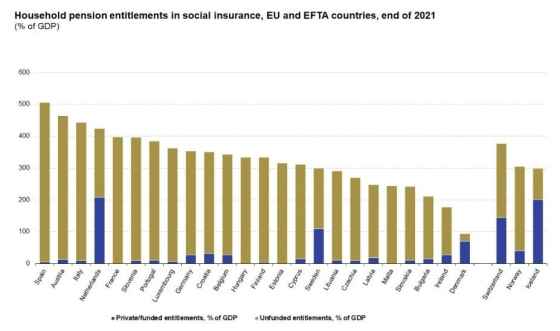 Questo grafico è il grafico. Perché mostra il livello di diritti acquisiti pensionistici non finanziati dell’Eurozona e dell’Efta. Tradotto, quanto sia alto l’Everest previdenziale europeo senza copertura. Le aree blu rappresentano invece i piani pensionistici privati o con copertura garantita. Per alcuni Paesi europei, Italia e Francia in testa, quell’ammontare a babbo morto equivale a una forbice che varia dal 300% al 500% rispetto al Pil. Capite da soli che di fronte a un default in attesa di compiersi come questo, deficit al 7% rappresentino barzellette. Infatti, può tranquillamente gestirli in un professionista del settore come Jean-Luc Mélenchon. E per il resto, come si fa? Una colossale Fornero. Ecco cosa ci attende.