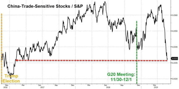 Non so voi, ma io comincio a essere stanco di queste prese per i fondelli. Perché non so se ve ne siete accorti ma nell’arco del lungo weekend elettorale europeo, di fatto iniziato giovedì scorso in Gran Bretagna e conclusosi solo domenica alle 23 con la chiusura delle urne in Italia, magicamente il dramma dei drammi non solo ha perso di intensità, ma è addirittura sparito dai radar dell’informazione: per caso è scoppiata la pace commerciale fra Cina e Usa, senza che nessuno ce lo dicesse? Così parrebbe. Eppure, questo grafico parla una lingua contraria: il livello della prezzatura del mercato rispetto a un epilogo positivo del dialogo fra Pechino e Washington è infatti ai minimi storici.