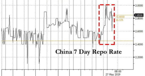 E infatti, nel silenzio generale di media troppo occupati a gridare per la vittoria di Marine Le Pen su Emmanuel Macron per addirittura un punto percentuale, ecco la reazione inaspettata del mercato cinese al salvataggio e alla proclamazione del Re nudo che questo ha comportato implicitamente. Come mostra il grafico, nonostante le autorità cinesi abbiano atteso il tardo pomeriggio di venerdì scorso per diffondere la notizia, garantendosi così due giorni di mercati e banche chiuse per farla digerire, ecco che l’ondata di shock ha trovato un altro modo per sostanziarsi. Inviare un bello scossone sistemico sul mercato obbligazionario cinese, con i costi di finanziamento in aumento netto e i rendimenti sul debito sovrano in forte crescita.
