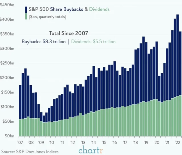 Cosa sa il mercato che noi comuni mortali ignoriamo? Che la farsa finirà ufficialmente a Jackson Hole. Ma che se la guerra non sarà più sufficiente a reggere il Pil e i buybacks a sostenere Wall Street, si interverrà anche prima. Qual è il problema, morale e sociale prima che finanziario? Come mostra questo altro grafico, dal 2007 a oggi, aziende quotate sullo Standard&Poor’s 500 hanno operato buybacks per un controvalore totale di 8,3 trilioni di dollari. Al netto del diluvio di riacquisti atteso per quest’anno, stante i dati al 31 gennaio. Soldi che finiscono in una partita di giro che, comunque sia, fa felici tutti: azienda, intermediario e investitore.