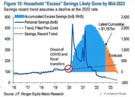 Ecco quindi che questo grafico ci mostra plasticamente come – entro metà di quest’anno – i colossali extra-risparmi su cui gli americani si sono seduti per interi trimestri di pandemia, saranno svaniti. Puff. Il tutto alla luce di condizioni finanziarie e creditizie che la Fed ha già infilato nel tunnel della contrazione. Plafond più bassi, mutui più cari, prestiti che richiedono organi interni come garanzia, piccole e medie imprese senza liquidità. E carte di credito/debito che esploderanno letteralmente, magari anticipate da allarmanti aumenti delle previsioni di charge off delle compagnie emittenti.