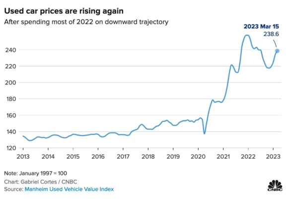 E tanto per non farci mancare un altro bel proxy di crisi reale, dopo un 2022 passato in fase discendente, il prezzo delle auto usate negli Stati Uniti è tornato a salire. Dai 218,2 dollari di media di gennaio, la scorsa settimana l’ultima rilevazione dell’indice Manheim per il settore ha segnato 238,6 dollari, stando al dato del 15 marzo e come mostra il grafico.
