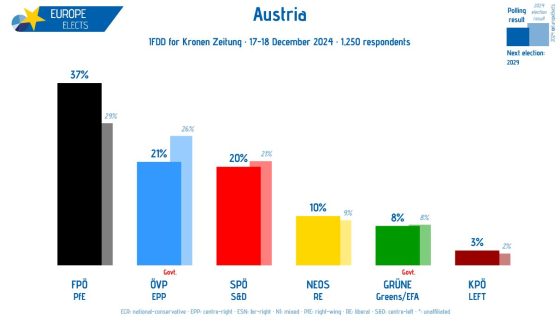 Ma non pensiate che la cosa sia appannaggio solo di certe latitudini. Anzi. Ricordate il voto austriaco del 29 settembre scorso? Anche in quel caso, fiumi di inchiostro e retorica contro l’onda nera della Fpo. La quale ha sì stravinto le elezioni, ma ha patito un trattamento alla francese da parte del presidente della Repubblica e dei due principali partiti: cordone sanitario antifascista, esclusi dai colloqui per la creazione di un nuovo Governo. Appestati. Che meraviglia la democrazia! Ebbene, a tre mesi da quel voto, qual è lo stato dell’arte nel piccolo Paese alpino? Nessun Governo. Nessun accordo. Ma prosecuzione della politica di non agibilità politica della Fpo. Il risultato concreto? Lo mostra questo grafico, relativo all’ultimo sondaggio disponibile, realizzato dal quotidiano Kronen Zeitung il 17-18 dicembre.