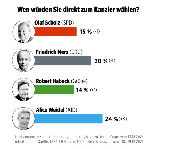 In seconda battuta, l’immigrazione. Altro tema cavalcato da sempre da Fpo, ovviamente fra le accuse di xenofobia. Difficile però per Popolari e Socialisti proseguire nel loro copione da democrazia sotto assedio, poiché appena caduto di regime di Assad, Vienna ha immediatamente bloccato gli ingressi a nuovi profughi siriani. E sta valutando uno screening delle posizioni di quelli già presenti sul suolo austriaco, al fine di valutarne i requisiti. Tradotto, porte chiuse. Se non per rimandare a Damasco qualche migliaio di non più aventi diritto. Ipocrisia fino al midollo. Ma i sondaggi non perdonano. Esattamente come questo, il quale ci mostra come a due mesi dal voto spartiacque in Germania, la leader di Alternative fur Deutschland sia vista dalla maggioranza degli interpellati come il miglior Cancelliere possibile.
