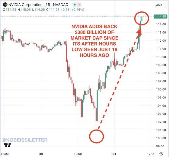 Ma date un’occhiata a questo grafico: Nvidia ha macinato 380 miliardi di market cap nelle 18 ore intercorse fra i minimi afterhours di lunedì notte e metà contrattazioni di giornata di martedì. Di fatto, l’intera capitalizzazione di Costco. In meno di un giorno. E dopo aver bruciato 1 trilione di capitalizzazione nelle ultime 5 settimane.