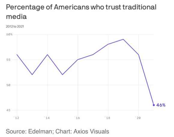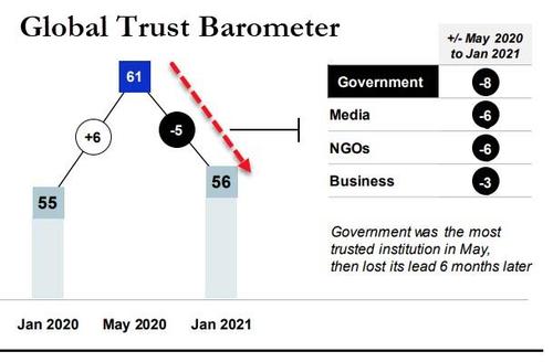 Il primo sintetizza i risultati dello studio compiuto da Axios rispetto al grado di fiducia dell’opinione pubblica nei mass media tradizionali negli Stati Uniti: con il 27% siamo al minimo storico. Perfetto per chi vuole che la realtà venga veicolata proprio da quei social media che hanno generato campagne di disinformazione da Oscar, a partire dal Russiagate in poi. E lo dico essendo il primo critico dei mezzi di informazione establishment, quelli che con un certo sprezzo del ridicolo – non so quanto involontario – in Italia abbiamo ancora il coraggio di definire autorevoli. Ma signori, quantomeno la stampa ufficiale ha un minimo di controllo cui fare riferimento e, soprattutto, padroni tanto potenti quanto noti nei loro interessi e posizionamenti. Quindi la sua narrativa, ancorché di parte, è facilmente tarabile nel livello di distorsione applicato al veicolare le notizie. I social network, da questo punto di vista, rappresentano davvero il lato oscuro. Il secondo grafico è ancora peggiore, quantomeno alla luce della variabile Covid, a mio avviso tutt’altro che in via di risoluzione, stante gli strani stop-and-go in atto attorno alla campagna vaccinale globale. Stando a dati dell’ultimo Trust Barometer della Edelman Research, sondaggio compiuto fra il 19 ottobre e il 18 novembre scorsi su oltre 33.000 persone in 28 Paesi nel mondo, infatti, nella seconda metà del 2020 il tasso di fiducia globale verso i governi e le istituzioni è letteralmente crollato dai massimi raggiunti a maggio. Timing perfetto: quando si pensava che il Covid fosse sconfitto, la gente è tornata a fidarsi dei governanti che la avevano salvata dalla pandemia. Non appena si è materializzata la seconda ondata tardo-estiva e autunnale, tracollo. E ovvio che, in un contesto simile, Wall Street e il concetto stesso di finanziarizzazione estrema del sistema risultino come perfetto capro espiatorio, bersaglio legittimo, detonatore e miccia di un carico di esplosivo che dal 2008-2009 ha continuato a crescere di volume e livello di instabilità.