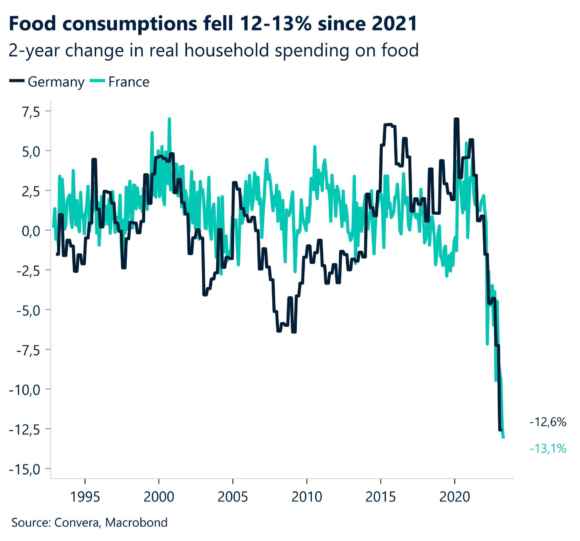 Guardate questo terzo e ultimo grafico: un 13% di calo nella spesa privata per beni alimentari negli ultimi due anni in Germania e Francia, come è spiegabile? Tutti con l’ossessione della forma fisica, di colpo? Stranamente, il tutto a inizio dal 2021. Quando in molti Paesi cominciano a venire ritirati i sostegni pandemici ad aziende e famiglie. E prima dell’Ucraina.