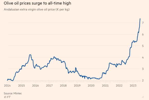 Comunque vada, quale sarà il drenaggio di contributo al Pil dell’Emilia-Romagna, se al 13 luglio ancora si utilizza la dizione presto per descrivere lo status delle risorse per la ricostruzione? Tutto superbonus e turismo, al fine di consolidare quell’1,3% di crescita previsto? Ora guardate questo grafico: la siccità estrema sempre giovedì ha fatto volare al record assoluto il prezzo dell’olio extravergine di oliva dell’Andalusia. Quello che spesso vede i suoi tagli meno pregiati miscelati con altre varietà di origine Ue, poiché di buona qualità ma a prezzo inferiore, ad esempio, a quello toscano o pugliese.