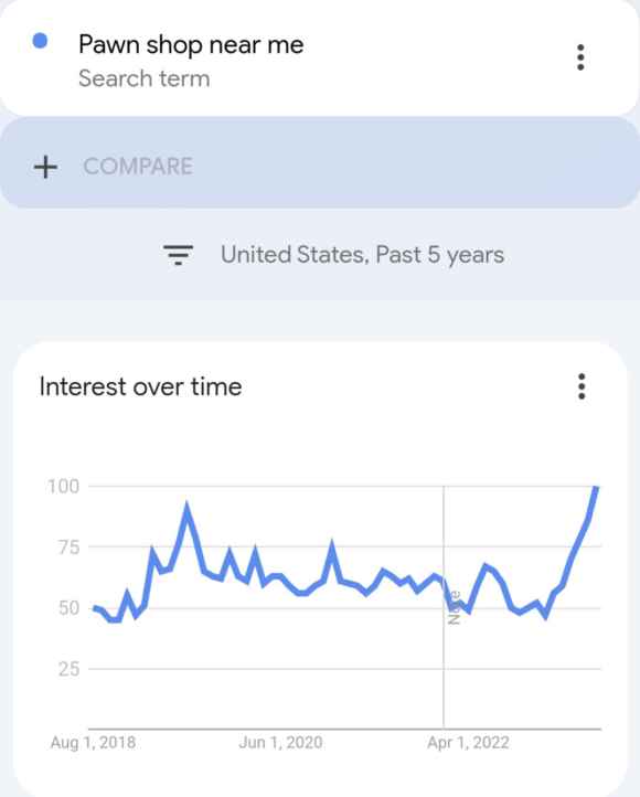 In America, dallo scorso gennaio le ricerche su Google relative al più vicino banco dei pegni sono cresciute in maniera costante. E oggi, stando a GoogleTrends, hanno raggiunto il massimo storico. Esiste un altro mondo, sottotraccia. Esiste un qualcosa che va oltre l’abuso di carte di carte revolving e di credito al consumo, che va oltre le delinquencies sulle rate della casa o dell’auto o delle bollette energetiche. Esiste quello che Karl Marx definiva Lumpenproletariat, di fatto il sottoproletariato urbano. Cencioso, letteralmente. Ebbene, qui ne abbiamo la versione edulcorata, social, quasi pittorescamente vintage nel suo essere bohémien da Qe. Si vendono le cose. Per dirla con Giovanni Verga, si venda la roba. Vestiti, scarpe, libri, elettrodomestici. Il superfluo. Ma visto da una prospettiva non razionalmente positiva, quanto di necessità: ovvero, quella giacca ancora mi piace e mi va bene. Ma pagare la bolletta o fare la spesa sono necessità inderogabili.