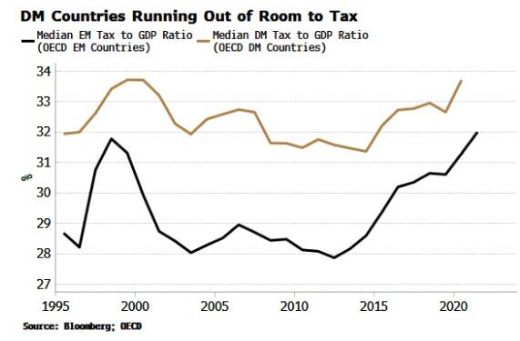 Se infatti come mostra l’immagine, la possibilità impositiva dei Paesi occidentali sta esaurendosi, pena il comparire in piazza delle ghigliottine e la distruzione del tessuto produttivo reale e non finanziario, proprio l’esempio italiano di probabile manovra correttiva ci mostra come l’unica alternativa sia il taglio della spesa. Ciò che si chiama “razionalizzazione”, tanto per non allarmare. Ovvero, decurtazione di servizi verso cittadini la cui capacità di spesa e di acquisto è già messa a dura prova da inflazione strutturalmente più alta e dinamiche salariali ormai secolarmente stagnanti. Insomma, se tassare di più non si può, si taglia. Spending review, ring any bells? E la tassazione, in effetti, rispetto alla riduzione dei trasferimenti ha un difetto: se sono disoccupato o indebitato cronico, difficile che possa pagare. Puoi pignorarmi, segnalarmi in centrale rischi, sfrattarmi. Ma da un rapa di Stato non cavi sangue. Puoi però togliermi servizi sanitari, trasporti e tutto ciò a cui, come cittadino-contribuente, avrei formalmente diritto. “Livelli essenziali”, questa la formula magica. A tutto il resto, Borsa in testa, penseranno le Banche centrali. Cut and print, appunto.