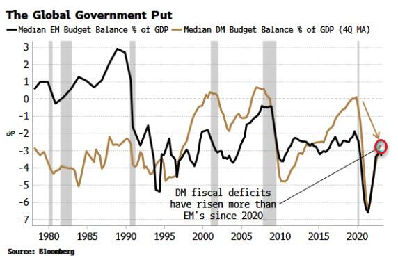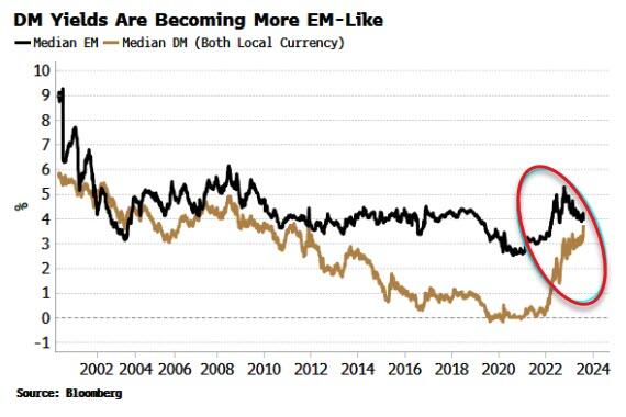 Prima di concentrarci sul tema specifico, date un’occhiata ai questi altri due grafici: il trend ci mostra una emergentizzazione del modello occidentale. Insomma, il Qe strutturale ha talmente ampliato i margini accettabili e accettati dal mercato di ricorso al deficit sistemico da vedere le nazioni evolute andare incontro a un futuro da Paesi in via di sviluppo, quando si parla di costi di finanziamento.
