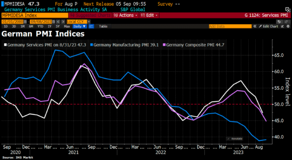 Ora, manovra correttiva significa due cose: o tagli della spesa o aumento della tassazione. Tertium non datur. Anzi, un certo livello di terzietà esiste. Ma se raggiunto, il passo successivo sarebbe esiziale: sblocco pressoché immediato di almeno 15-20 miliardi dei 35 previsti dalla terza e quarta tranche del Pnrr. E, soprattutto, loro destinazione ad minchiam, passatemi la definizione. Con il beneplacito dell’Ue, al fine di evitare un effetto domino nell’Eurozona innescato dall’elefante italiano nella stanza. Anche perché il grafico parla chiaro: se il PMI tedesco reso noto oggi parla la lingua del disastro in tutte le sue componenti, ecco che quella dei servizi addirittura è precipitata in piena contrazione a 47.3. L’attesa degli analisti era per una lettura di 51.5. E piaccia o meno, l’interdipendenza dell’economia reale italiana da quella tedesca è forte. Macchinari e componentistica in testa.
