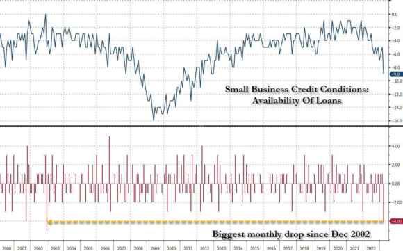 E sempre due giorni fa, un’altra catena di fast food, Subway, ha visto la propria sale auction raccogliere una valutazione di soli 7 miliardi contro i 10 attesi. Tradotto, si attende che l’acqua salga al livello del mento per fare l’affare del secolo. Non a caso, in contemporanea la ratio di valutazione di McDonald’s volava. Inoltre, come mostra questo altro grafico, scopriamo come la disponibilità bancaria a nuovi prestiti verso Pmi negli Stati Uniti abbia toccato il livello più basso dal 2012, stando ai dati raccolti dalla Nfib nel suo Small Business Optimism Report appena pubblicato.