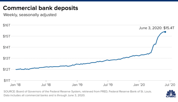 Sapete attualmente in quanto denaro stanno sguazzando le banche americane “grazie” alla crisi Covid? Stando a dati ufficiali Fdic appena diffusi, da fine gennaio a oggi sono fluiti sui conti degli istituti a stelle e strisce qualcosa come 2 triliardi di dollari di nuovi depositi, come mostra il grafico. Un wall of money senza precedenti, se si pensa che soltanto nel mese di aprile i depositi sono cresciuti di 865 miliardi di dollari, una cifra che da sola è più alta del precedente record relativo però a un intero anno.