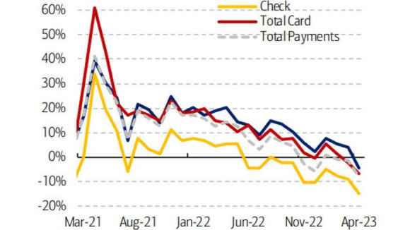 Solo feticisti, short-sellers e avvoltoi, gli stessi che hanno fatto man bassa di prestiti al comparto Cre che con il prossimo round di Qe si tramuteranno in oro. Eh già, la Fed è come Re Mida. Basta saper aspettare. E avere le riserve in eccesso piene, però. E le spalle larghe. Perché come mostra questa seconda immagine, ecco che l’internal data di Bank of America relativo all’uso di carte di credito/debito mostra come i pagamenti totali della clientela di small business – categoria che include tutto, persino ACH e assegni – abbiano segnato il primo calo dal gennaio 2021.