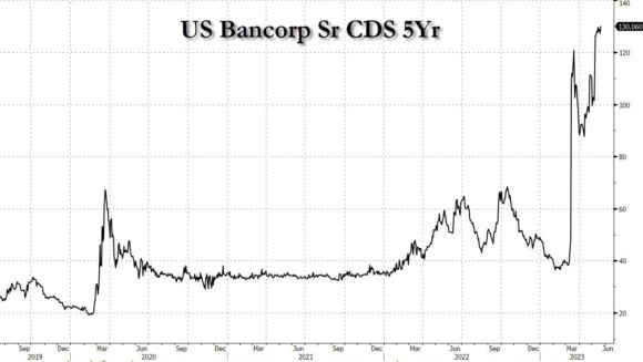 Insomma, brace for impact. Ma anche in questo caso, a chi interessano i fondamentali macro e l’economia reale, quando Wall Street ti garantisce una realtà filtrata da lenti rosa? Ed ecco che dai meandri del deep market, quegli indicatori per soli addetti ai lavori, ci giunge l’ennesima conferma chiara e preoccupante del livello di pantomima in atto sul mercato rispetto al tetto del debito. Lo spread fra Bills a maturazione il 30 maggio e quelli con maturazione solo 48 ore dopo, il 1 giugno, segna una divaricazione record. Il motivo? Formalmente, nessuno vuole detenere Treasury a breve che maturino – anzi, non maturino – dopo l’ora X definita da Janet Yellen per il default. Short-selling alle stelle? Zero. I Bills a maturazione 1 giugno scontano solo 5 punti base più del GC, il General Collateral che di fatto opera da benchmark. Attenti alle farse, però. Raramente capita anche che finiscano in tragedia. Non a caso, la parola d’ordine è contagio. Perché se il fatto che PacWest – per guadagnare qualche giorno di sopravvivenza – stia operando come un rivenditore di gomme da neve a metà luglio può lasciare indifferenti, il credit default swap delle obbligazioni senior della quinta banca degli Usa che torna a esplodere potrebbe significare altro