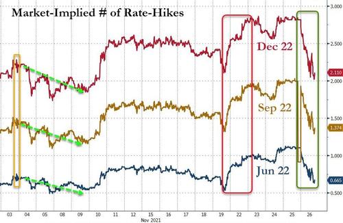 Signori, abbiamo tutti l’anello al naso o forse è ora di darsi una svegliata collettiva? Serviva l’ennesima, teatrale scena da peste manzoniana all’orizzonte con coté di Borsa che crolla. L’hanno orchestrata. Sempre peggio, però. Ormai, la lucidità scarseggia. E sapete qual è stato il vero risultato ottenuto dalla sell-off di venerdì scorso? Ce lo mostrano questi due grafici, plasticamente: un crollo della prezzatura dei tre aumenti dei tassi da parte della Fed nel corso del 2022 e, soprattutto, una dinamica che negli ultimi trenta anni – da quando cioè sono stati introdotti i futures sul petrolio – si è avverata solo 14 volte. Un tonfo intraday del prezzo del barile di almeno il 10%, come avvenuto appunto nell’ultima, sanguinosa seduta della scorsa settimana, ha storicamente portato con sé un notevole e pressoché immediato calo del prezzo della benzina alla pompa negli Stati Uniti. Guarda caso, proprio oggi che il carburante nei distributori Usa viaggia sui 5 dollari al gallone e alla porte di sono gli spostamenti per le festività di fine anno. Che coincidenza fortuita.