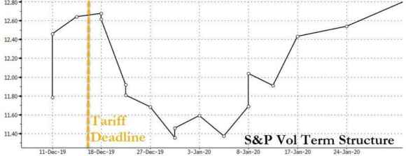 Terzo, prima o poi andrà affrontato il nodo principale della questione: potrà mai il mercato tornare a operare autonomamente, quindi a essere di nuovo libero? I controvalori in discussione, signori, parlano chiaro. Se già l’aver reso praticamente sistemiche e strutturali le aste di finanziamento cominciate lo scorso settembre e prorogate con aumento delle disponibilità tradiva la gravità reale della situazione, davvero pensate che il mercato non prezzi in realtà il bazooka appena messo in campo come ulteriore criticità ontologica da cui mettersi al riparo? Certo, per qualche tempo l’entusiasmo per il presunto accordo fra Usa e Cina unito a questo firewall della Fed garantirà mercati esuberanti e sempre nuovi record, ma, prima o poi, toccherà prendere atto del fatto che senza Fed (o Bce o Bank of Japan) non esiste più mercato, saremmo tornati al 16 settembre 2008, il day after del fallimento Lehman. E per quanto io non voglia sempre cercare lati negativi o indirizzare l’indice verso il bicchiere mezzo vuoto, è intuitivo il fatto che quanto denunciato nella notte da Edward Lawrence di Fox Business parli molto chiaro anche sulla veridicità e la credibilità di lungo termine dell’accordo commerciale, il quale ha una valenza anche finanziaria, oltre che meramente commerciale e di impatto sulle economie, come mostra questo grafico: la struttura della volatilità dello Standard&Poor’s 500 non permetteva aumenti tariffari il 15 dicembre prossimo. Punto.