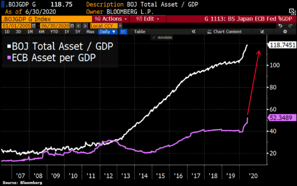 La spinta finale nel raggiungimento di questo limite faustiano l’ha ovviamente garantita l’asta Tltro di rifinanziamento bancario a lungo termine con i suoi 1,32 triliardi di euro di liquidità forniti agli istituti di credito. Al netto di tutti gli offsetting, nel mese di giugno abbiamo assistito a 600 miliardi di aumento negli assets, pari all’11% del totale. Ma, cosa ben più grave e chiaramente mostrata dal grafico, per la prima volta il bilancio della Banca centrale europea ha superato la linea spartiacque del 50% di rapporto rispetto al Pil dell’eurozona. Per l’esattezza, siamo al 52,35%. Anche in questo caso, giapponesizzazione totale.