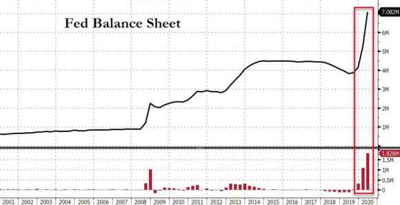 Nella giornata del 30 giugno, il Dow Jones ha chiuso le contrattazioni segnando il miglior secondo trimestre dal 1987. Roba da record. Come vi dicevo nel mio articolo di martedì, siamo in pieno rally da bear market. Tradotto, mentre l’economia reale va in pezzi – colpita quasi a morte della mazzata finale del lockdown -, Wall Street festeggia. Stando a calcoli di Goldman Sachs, fra aprile e fine giugno, negli Usa le aziende quotate hanno venduto azioni attraverso offerte secondarie per un controvalore record di 113 miliardi di dollari. La febbre dell’oro applicata alla distorsione di mercato da Banca centrale. Non ci credete? Bene, guardate questo grafico, il quale ci mostra la traiettoria folle in cui è andato a infilarsi il bilancio della Banca centrale Usa, oggi al record assoluto di oltre 7 triliardi di dollari.