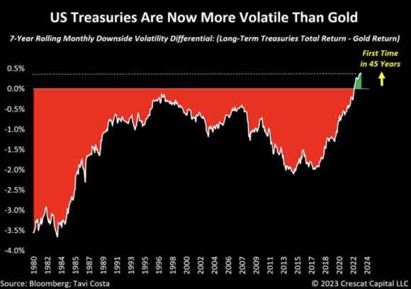 Volete un bell’esempio di come tutto sia cambiato? Guardate questo altro grafico: per la prima volta in 45 anni, la volatilità ribassista mensile dei Treasuries Usa è superiore a quella dell’oro a livello di total return.