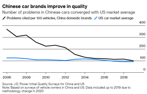Interpellato sempre da Bloomberg, ecco cosa ha dichiarato il vice-presidente delle overseas operations di Aiways Automobiles, Alexander Klose: Lo switch verso le batterie ha fatto in modo che il motore di un’auto non sia più un elemento di differenziazione. Questo ha creato un livello nel campo di gioco operativo completamente differente. E come mostra il grafico, i brands cinesi hanno ormai colmato il gap di qualità e affidabilità con quelli statunitensi.