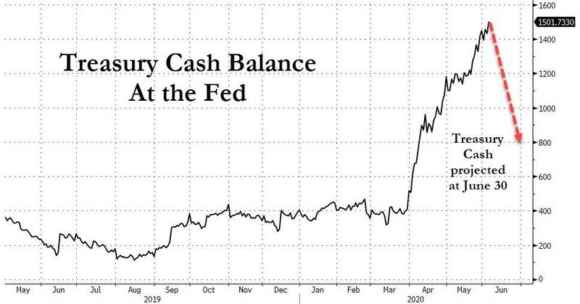 Cosa ci attende? Anzi, per meglio dire, quale coniglio starebbe per estrarre dal cilindro Donald Trump, da qui a quindici giorni? Pù che un coniglio, the gorilla in the room, stando sempre alle immaginifiche metafore degli operatori. A offrire una risposta ci pensa questo grafico, dal quale si nota intuitivamente come da qui alla fine del mese il cash balance del Treasury statunitense debba calare drasticamente dall’attuale livello record di 1,5 trilioni di dollari alla cifra obiettivo prefissata nel Treasury General Account per la fine del secondo trimestre. Ovvero, 800 miliardi come target.