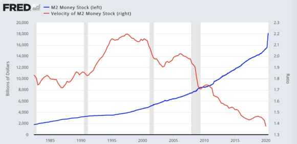 E qui subentra una terza ma fondamentale variabile, contenuta in questo grafico: di fatto, i cicli di Qe hanno sì garantito un aumento della massa monetaria M2, ma non il suo fluire nell’economia reale. Quell’aumento di stock si è sostanziato unicamente in deficit, una partita di giro fra Wall Street (principale e pressoché unica beneficiare reale dell’operatività straordinaria della Fed) e Washington, intesa come potere politico di ogni connotazione e colore di amministrazione federale succedutasi.