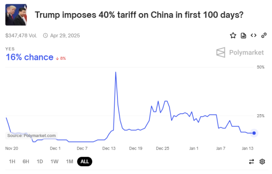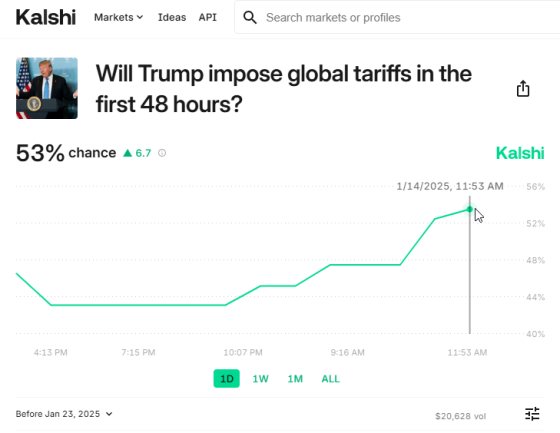 Il primo mostra come il mercato prezzi solo un 16% di possibilità che il Presidente imponga dazi del 40% sui beni cinesi nei primi 100 giorni. Insomma, un bluff a colpi di esenzioni come durante la prima Amministrazione del tycoon. Molta retorica, poca ciccia. Il secondo, invece, mostra come la possibilità di tariffe a livello globale nelle prime 48 ore di mandato sia salita dal 46% al 53% dopo il tweet.