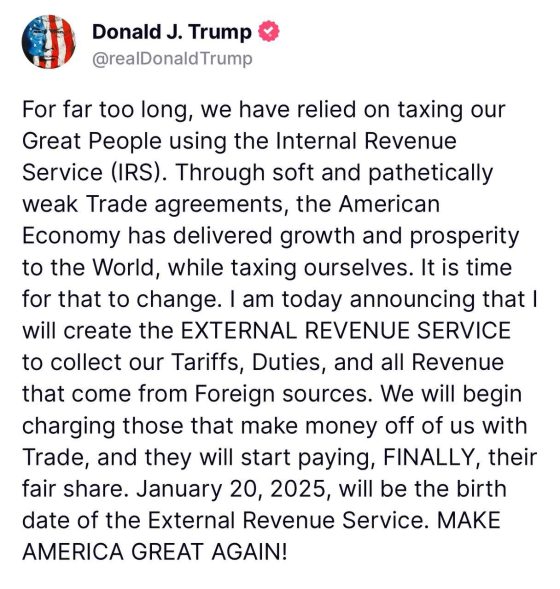 Lasciate stare la Fed. E i tassi fuori controllo rientrati miracolosamente in un range in allarme contenuto grazie al solito effetto jo-jo dell’inflazione. Anzi, in realtà, quei tassi così ballerini e pronti a ogni necessità, prendeteli pure in esame. Ma come conseguenza del contenuto di quel tweet di tre giorni fa. Non a caso, da quando Donald Trump ha postato sul social amico la sua intenzione di dare vita a un’agenzia per trasformare i partner commerciali esteri Usa in contribuenti – con tanto di nome, External Revenue Service (Ers) -, è cominciata a circolare la voce di un aumento dei tassi alla riunione del Comitato monetario del 28-29 gennaio