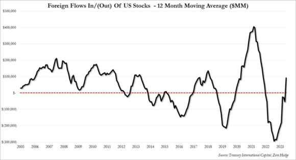 In compenso, questo secondo grafico appare rivelatore. Ci dice come dopo 17 mesi di letture negative, in giugno non solo il trend di acquisto di equities statunitensi da parte di investitori stranieri sia tornato in positivo. Ma addirittura per un controvalore di 92,2 miliardi di dollari.