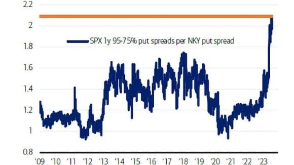D’altronde, solo fino a poche settimane fa, la Fed ormai si era fermata. Certo, la minaccia di nuovi rialzi restava sul tavolo. Come la proverbiale pistola. Ma agosto era il mese di riflessione. E Jackson Hole, nelle speranze di molti, avrebbe potuto rivelarsi nulla più che una tappa intermedia, un pomposo crocevia per ribadire la necessità di operare in base a una dinamica data-dependent. La quale. si sa, è facilmente manipolabile tramite aggiustamenti stagionali e revisioni ad hoc. Però quest’altro grafico ci mostra anche altro. Una put spread strategy che parla la lingua di qualcuno che, al netto dei prezzi stracciati offerti dalle opzioni ufficiali per coprirsi da un tonfo, già negli ultimi 20 giorni stava montando posizioni da crash hedge.
