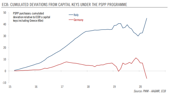Lo ripeterò fino alla noia e alla nausea, fatevene una ragione: i movimenti attorno al nostro debito di queste settimane, dall’andamento dello spread all’emissione del Btp Italia, non possono prescindere dal fatto che la nostra quota di obbligazioni sovrane acquistate automaticamente dall’Eurotower è passata dal 17% al 32%. È questa la chiave di lettura, la cartina di tornasole, la lente d’ingrandimento da utilizzare, sempre e comunque: non si può ignorare il fatto che, quando parliamo di Italia, parliamo di un paziente già oggi in terapia intensiva. E intubato. E Dio non voglia che, a breve, qualche intoppo politico relativo alla sentenza della Corte di Karlsruhe metta in discussione quella dinamica, altrimenti la retorica dell’Italia che non necessita di aiuto e che può farcela tranquillamente per via autarchica emettendo Btp si tramuterebbe in tempo zero da farsa a tragedia. I mercati, di fatto, non attendono altro che la prova del bluff per andare all-in.