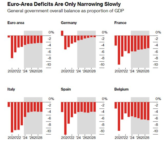 Guardate qui. Questo grafico ci mostra la prospettiva di deficit dell’Eurozona e di alcuni Paesi membri, da qui al 2028. Non a caso, il grafico è stato elaborato da Longview Economics. Nomen omen.