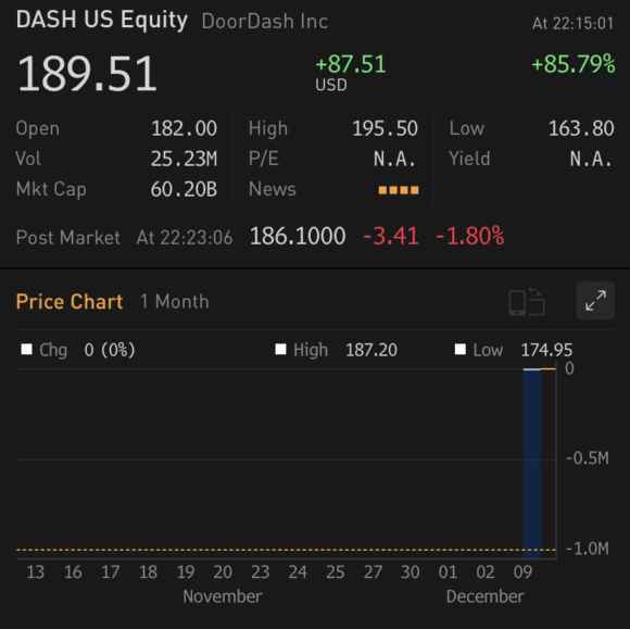 Inoltre, questo grafico mostra più di una criticità legata ai margini di profitto dei due comparti, quello della ristorazione tradizionale e quello del delivering affidato a una terza parte. E chi lo ha pubblicato, proprio nel giorno dell’ennesima Ipo stellare? Il Wall Street Journal. Ovvero, il giornale di riferimento della comunità finanziaria stronca le eccessive velleità di Doordash e il mercato come risponde? Spedendo il titolo a 182 dollari per azione, dai 102 del pre-market.