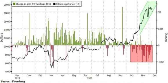Qualcosa non va. E non tanto per la questione in sé, bensì per il contesto generale: c’è nell’aria odore acre di last hurrah, di ultimi giorni dell’impero dell’irrazionalià prima dell’inevitabile redde rationem. Qualcosa sta cambiando, sottotraccia. E lo sta facendo in maniera tanto rapida, quanto impercettibile dall’esterno. Guardate questo ultimo grafico, il quale ci mostra come i flussi in uscita dagli Etf legati all’oro stiano entrando direttamente in quelli su Bitcoin: è cambiata la percezione di bene rifugio. Come mai? L’oro non è più inteso come impermeabile alle crisi da finanziarizzazione estrema? No. Ma l’oro è negoziato, cartolarizzato, piegato a logiche come quelle dei futures. Esiste l’oro fisico e quello di carta, esiste il diritto di delivery e la speculazione fine a se stessa. Esiste, soprattutto, una ratio fra contratti e lingotti che vede questi ultimi in quantitativo infinitamente inferiore ai primi. Esiste, di fatto, il trucco.