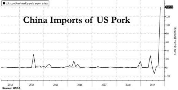 Non solo il prezzo della carne di maiale in Cina ha raggiunto livelli mai registrati (e ormai poco sopportabili, a fronte del potere di acquisto delle classi medio-basse con in tasca una valuta obbligatoriamente svalutata), ma stando a dati ufficiali, nella settimana terminata il 3 ottobre scorso, le importazioni di carne suina statunitense in Cina hanno toccato 142.200 tonnellate metriche, sette volte rispetto alle 19.900 dell’intero mese di settembre. In una sola settimana. La situazione, aggravata dalla crisi di Hong Kong, in Cina stava precipitando: e voi, in caso foste alla vigilia di una catastrofe, andreste da quello che è percepito come il vostro peggior nemico a chiedere aiuto? E quest’ultimo, soprattutto, pensate che ve lo offrirebbe così, senza contropartite?