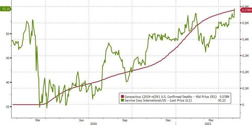 E cosa può accadere? Guardate questo grafico, il quale appare la dimostrazione plastica di come una sciagura generale possa rivelarsi la fortuna di una vita per qualcun altro. Compara il numero di vittime per Covid negli Usa (linea rossa) con il trend azionario del titolo della Service Corp. International (linea verde), azienda leader nel settore delle pompe funebri.