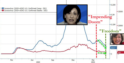 La signora che vedete rappresentata nelle due fototessere del primo grafico è Rochelle Walensky, la direttrice del CDC e le linee di demarcazione rossa e verde rappresentano altrettanti cambi di strategia da parte dell’istituto che sovra-intende alla lotta al virus. Il 29 marzo scorso, parlando ai cittadini Usa, la Walensky utilizzò appunto la formula dell’impending doom, di fatto traducibile come condanna imminente, rispetto alla nuova ondata di Covid negli States. «Ad oggi, sono spaventata», disse la direttrice con viso contrito e teso. Bene, sei settimane dopo, liberi tutti. Tanto che il CDC ha appena comunicato ai cittadini Usa come la somministrazione completa di vaccino permetta la partecipazione ad attività al chiuso o all’aperto senza mascherina, né distanziamento. Il secondo grafico mette la situazione in prospettiva: forse la Walensky ha compiuto un atto di terrorismo a fin di bene, spaventando la popolazione per convincerla a vaccinarsi in massa e raggiungere il prima possibile un prodromo di immunità di gregge che avrebbe reso possibile la recente eliminazione delle restrizioni? In parte, pare di sì. Ma il trend è andato in discesa molto in fretta. E ben prima di raggiungere quel 75% di vaccinati che a detta di tutti gli specialisti, professor Anthony Fauci in testa, avrebbe garantito un’effettiva base di immunizzazione sufficiente per ripartire in sicurezza. Guarda caso, il medesimo tasso fissato informalmente da James Bullard, numero uno della Fed di St. Louis, affinché la Banca centrale mettesse sul tavolo la discussione sul tapering del programma di acquisti. E il board di giugno si avvicina: 15 e 16 del prossimo mese, appuntamento decisamente importante. Ma, a questo punto, temo ancora beneficiato e beneficiario di uno stop and go strumentale.