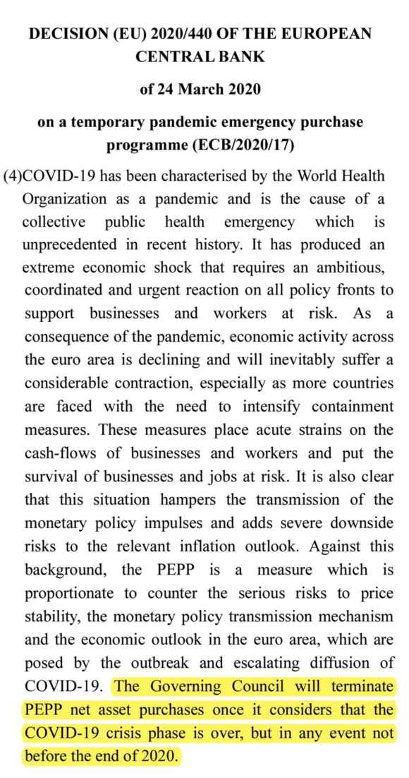 Guardate queste pagine sono tratte dall’atto costitutivo del Pepp, la cui versione integrale potete trovarla a questo indirizzo. Formalmente, sembra che non vi sia nulla di strano. La prima riporta in sottolineato il carattere temporale del programma appena posto in essere: per tutta la durata della crisi da coronavirus e, comunque, non prima della fine del 2020.