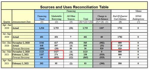 La frase utilizzata da Blanchard sembra la sintesi del buonsenso: The 1.9 trillion program could overheat the economy so badly as to be counterproductive. Eppure, ha scatenato il pubblico ludibrio. Forse, anche per la sua contemporaneità con la lettera dei 100 alla Bce, missiva su cui fino a sei mesi fa l’economista francese avrebbe apposto la sua firma in testa all’elenco. E con la penna multicolore. Cos’ha fatto cambiare idea all’ex numero due del giubilato Strauss-Kahn? Forse, la notizia delle notizie, oscurata debitamente all’attenzione mediatica dal caos organizzato ed eterodiretto di GameStop. E contenuta in questo grafico: nella sua Borrowing forecast della scorsa settimana, il Tesoro Usa ha infatti comunicato che nel trimestre in corso le necessità di finanziamento – tradotto, emissioni di debito – saranno pari a 275 miliardi di dollari, il 75% in meno rispetto al triliardo e 127 miliardi preventivato solo nel bollettino del novembre 2020. Qualcosa come 853 miliardi in meno di controvalore da emettere sul mercato per finanziarsi, come mai? Gli americani hanno forse scoperto qualche strana formula che li fa indebitare senza bisogno di aste di rifinanziamento?