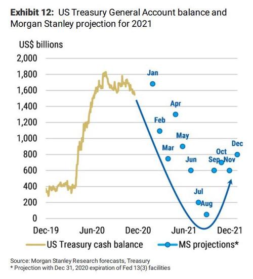No, semplicemente sta entrando nel vivo il dispiegamento del “tesoretto” di riserve in eccesso di cui vi ho più volte parlato e che Steven Mnuchin ha garbatamente lasciato in pegno al suo successore al Tesoro, Janet Yellen. In tale contesto, il Treasury General Account calerà entro agosto a soli 800 miliardi di saldo da quota 1,729 triliardi del 31 dicembre 2020, un tonfo senza precedenti di 929 miliardi di dollari, come mostra questo grafico.