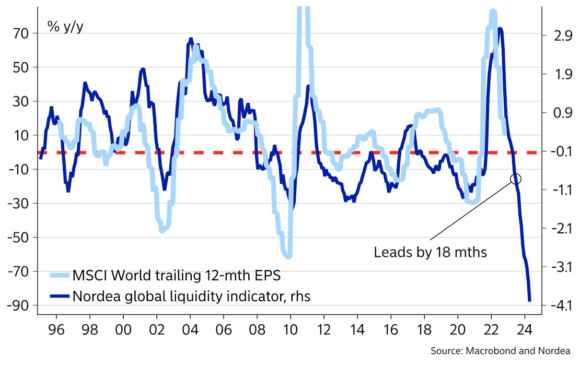 La facility di reverse repo della Fed di New York ha infatti visto 113 controparti depositare qualcosa come 2,554 trilioni di dollari. Record assoluto. Certo, la contemporaneità di scadenza del fine trimestre con il fine anno ha spinto le banche a parcheggiare fuori bilancio liquidità. Così come un tasso repo al 4,30% ha operato da ulteriore calamita, soprattutto con il repo del GC al di sotto di quel livello. Ma occorre prendere atto di una dinamica contemporanea, quella rappresentata dalla seconda immagine: stando alle rilevazioni di Nordea, oggi l’indice della liquidità globale è al minimo storico assoluto. Uno strapiombo. Ovvero, liquidità a picco sul mercato, ma contemporaneamente parcheggiata su livelli record overnight alla Fed di New York: uno starnuto sul rischio di controparte e l’effetto “fondo pensione inglese” è garantito. A livello globale, però.