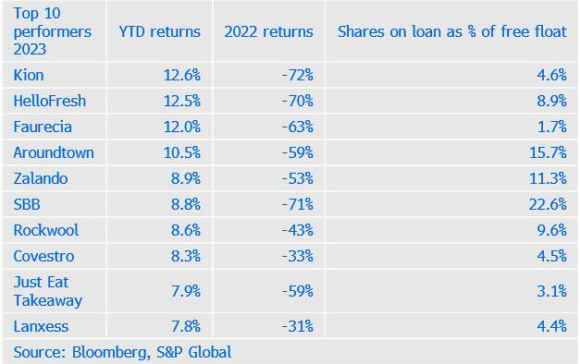 Osservando i comparti a maggior performance, infatti, si scopre che si tratta dei medesimi big losers del 2022: automotive, real estate e retail. Rispettivamente a -20,1% lo scorso anno e +4% da inizio 2023, -40,1% e +3,9% e -32,6% e +3,7%. Ma non basta. Come mostra la tabella, a brillare sono i titoli con lo short interest più alto. Ovvero, azioni che vedono una percentuale ragguardevole di flottante disponibile per essere presa in prestito per scommesse al ribasso.