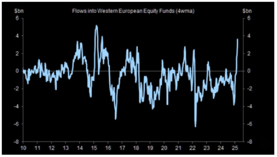 Il mercato azionario europeo ha appena registrato l’afflusso di capitali sull’arco temporale delle quattro settimane maggiore da oltre un decennio a questa parte. Insomma, gli hedge funds vendevano titoli Usa – soprattutto tech, quelli con le valutazioni più sopravvalutate e più a rischio di botto – alla clientela retail che li comprava sulle piattaforme di negoziazione online, certa di aver appena fatto l’affare del secolo.