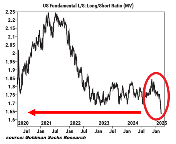 Guardate questi tre grafici, i quali ci mostrano cosa è accaduto nel mese di febbraio. La ratio long/short (ovvero il bilancio fra acquisti e vendite di equity) degli hedge funds è precipitata al minimo da almeno 5 anni e, udite udite, ha toccato un livello addirittura più basso di quello registrato durante il crash da Covid del 2020. Di più, i medesimi hedge funds hanno venduto titoli azionari per le ultime 10 settimane su 11.